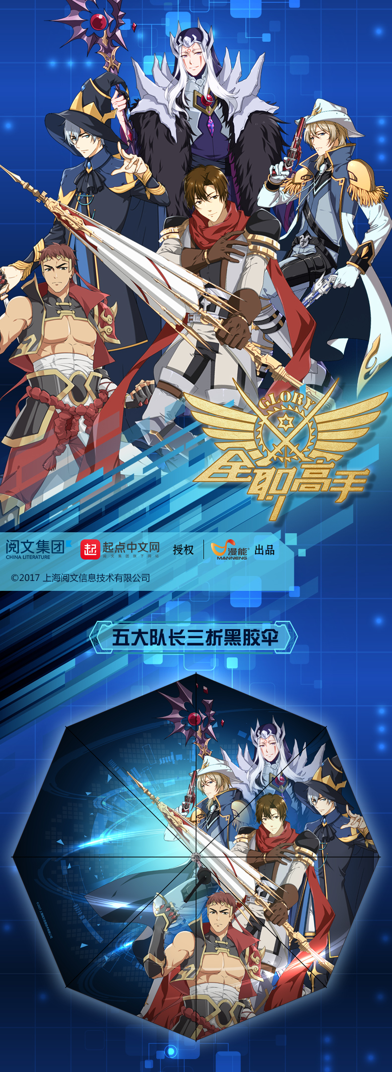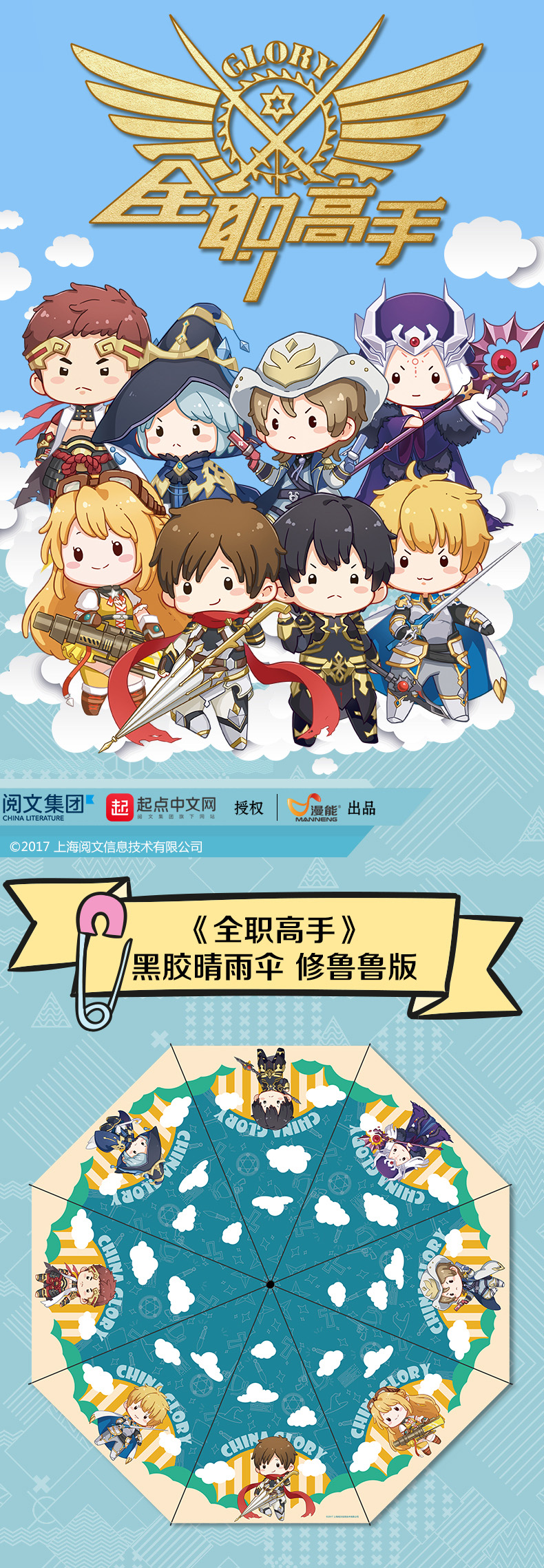 作为《全职高手》这个IP的打造者,阅文集团选择与漫能合作,是对漫能的极大肯定。《全职高手》晴雨伞的推出,标志着漫能的设计水平上升到一个新的高度。漫能在消费者心中口碑极佳,赢得版权方高度信赖,以独创、原创及新理念为发展方针。敢为人先是漫能品牌文化的精神魂魄,漫能勇于担当,引领创新,创造一个新时代潮流。