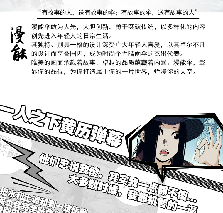 漫能标语:1、送你一把漫能伞,为你撑起一片天 2、有故事的人,送有故事的伞;有故事的伞,送有故事的人 3、每一把伞都有自己的故事,每一款设计都为迎合你的腔调